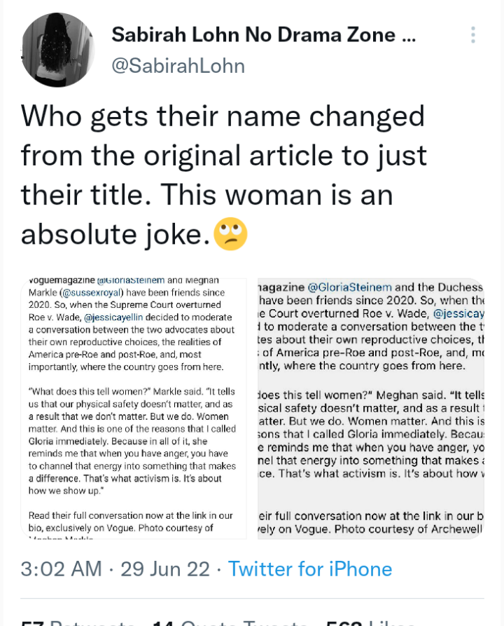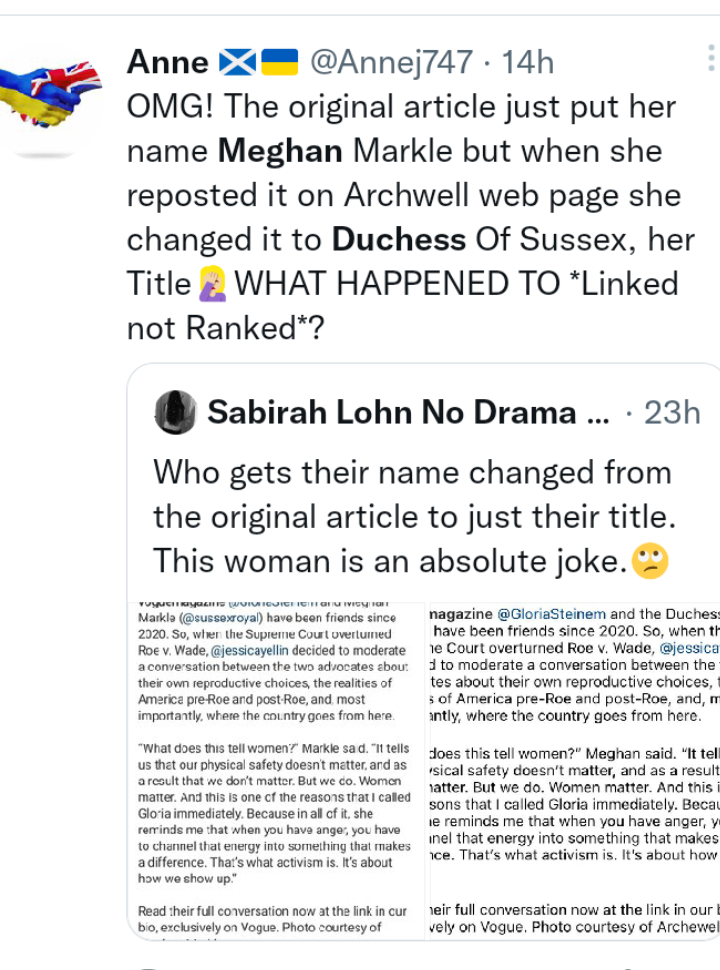 Some are claiming that the original Vogue magazine article named her as Meghan Markle, which the former American changed to as the Duchess of Sussex when she reposted it on the Archwell website.