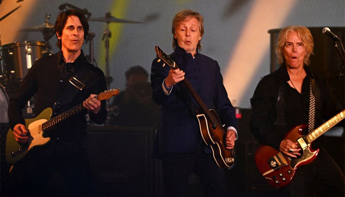 McCartney, one of the greatest songwriters of the 20th century along with the late John Lennon, paid tribute to his former bandmates in a nearly three-hour show. He played George Harrison's "Something" and performed a virtual duet with Lennon on "I've Got a Feeling."